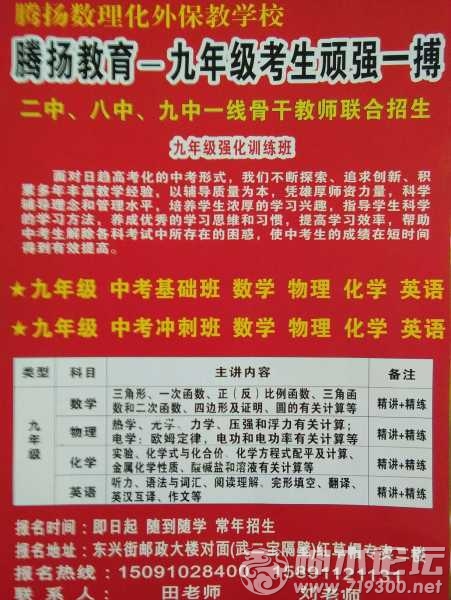 腾扬教育每晚班,周末班,招生火热报名中…… 招生对象:小学,初中,高中 小学部:(一年级至六年级) 开办科目:语文,数学,英语 初中部:(七年级至九年级) 开办科目,数,理,化,英 高中部:(高一至高三) ...