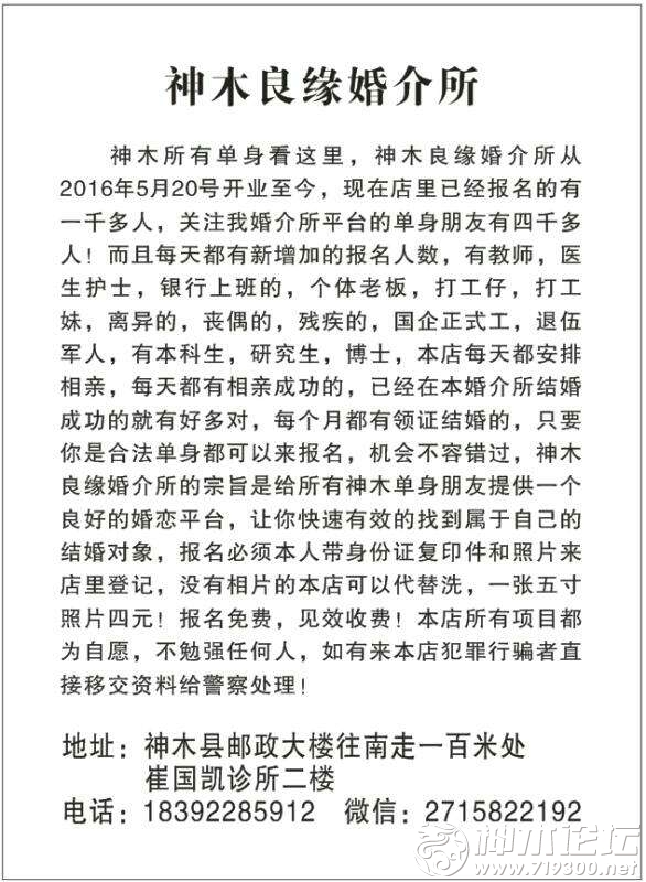神木所有单身看这里,神木良缘婚介所从2016年5月20号开业至今,现在店里已经报名的有一千多人,关注我婚介所平台的单身朋友有四千多人!而且每天都有新增加的报名人数,有教师,医生护士,银行上班的,个体老板,打 ...