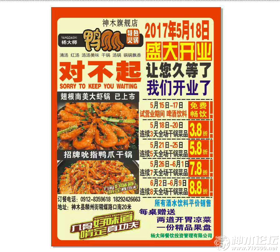 杨大师鸭爪爪盛大开业,地址:神木县麟州街精煤路口南20米 ??5月15日~17日试营业期间啤酒饮料免费畅饮 ??5月18日~20日连续3天全场干锅菜品3.8折 ??5月21日~25日连续5天全场干锅菜品5.8折 ??5月26日~6月1日连续7天全场 ...