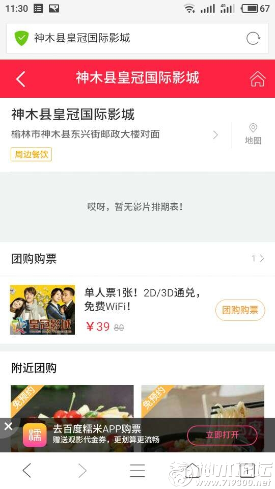 1.团购只有百度糯米,其他团购没有。 2.团购没有影片档期,只有单人通票,或者情侣通票。 3.没有影院零食团购。