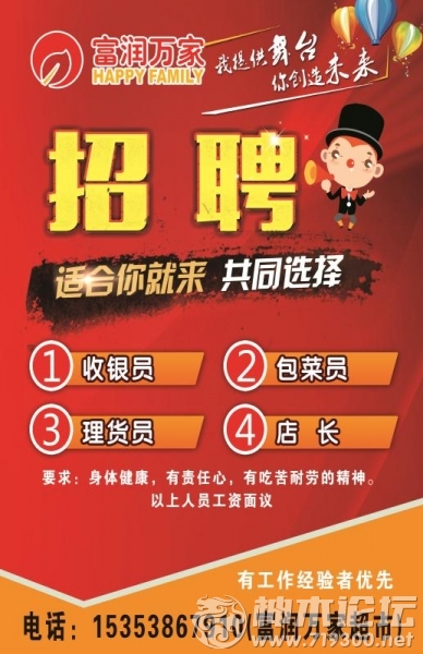 富润万家现面向社会招聘:包菜员;理货员;收银员;店长 只要你有一颗上进心,只要你敢于挑战,就请加入富润万家的团队! 联系电话:15353867910  王经理