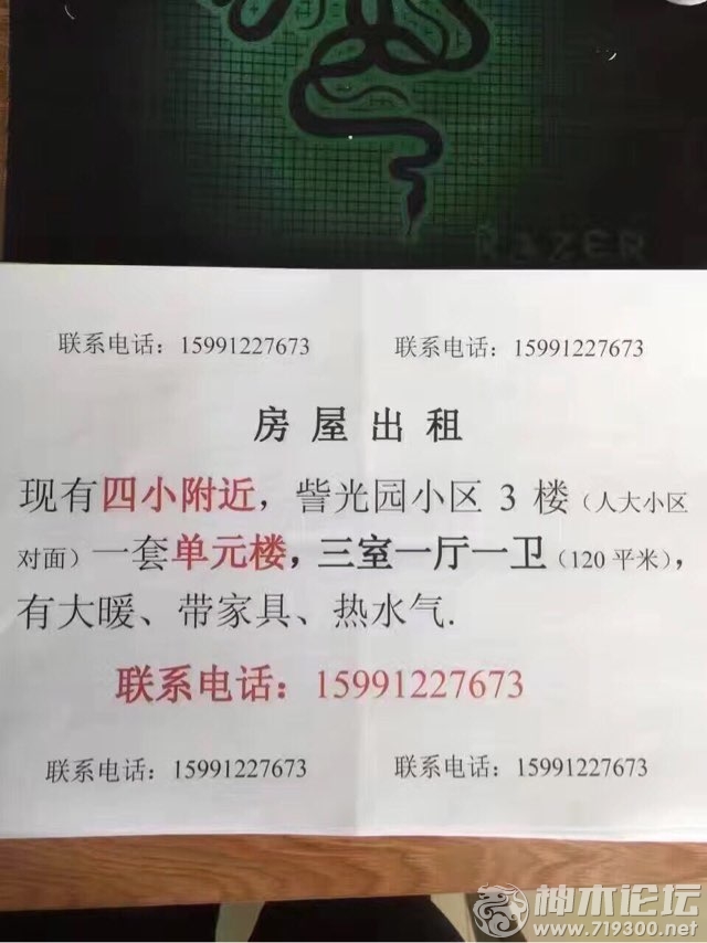 神木四小附近!恵民路!紫光园小区单元楼出租。有大暖、家具。电话:15991227673