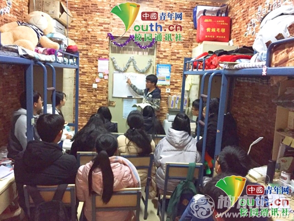 近期各高校迎来期末考试周,许多同学都在为期末考试努力复习着。日前,云南曲靖师范学院的一个学生寝室出现了这样一幕场景:在一间由四个高低床的寝室过道里,坐着一群学生,手拿着笔和书,眼睛不停地看着小白板;白 ...