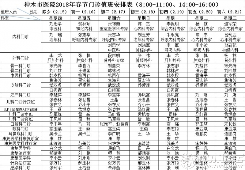 2018年春节放假期间即除夕至正月初六(2月15日至2月21日)神木市医院门诊上班时间为8:00-11:00,14:00-16:00,上班时间外如有就诊患者请到急诊科就诊,儿科门诊24小时上班,春节放假期间 ...
