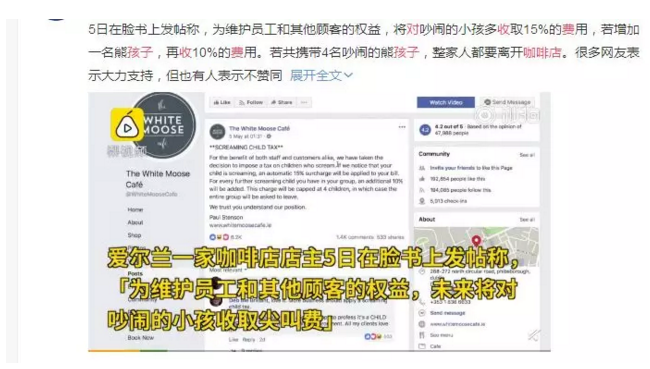 爱尔兰一咖啡店店主5日在脸书上发帖称,为维护员工和其他顾客的权益,将对吵闹的小孩多收取15%的费用,若增加一名熊孩子,再收10%的费用。若共携带4名吵闹的熊孩子,整家人都要离开咖啡店。 很多网友表示大力支持 ...