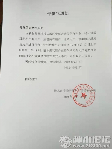 停供气通知 尊敬的天然气用户: 因新村鸳鸯塔桥头城区中压改造停供气作业,我公司需对新村所有用户、店塔所有用户、北站用户、水磨河林场周边用户进行停气,计划停供气时间为2019年8月17日上 ...