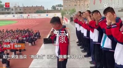 8月27日,网友爆料,陕西榆林市一中学,这个初三小男生当着众多师生的面郑重承诺:我要考571分!我要考571分!对方称, 如果实现,中考就可以上重点高中了。 来源:大河报