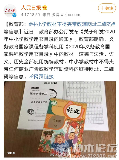 本帖最后由 闲聊君 于 2020-4-19 15:20 编辑 中小学教材不得夹带教辅网址二维码 近日,教育部办公厅发布《关于印发2020年中小学教学用书目录的通知》,公布了2020年普通中小学、特殊教育学校和体育运动学校教学 ...