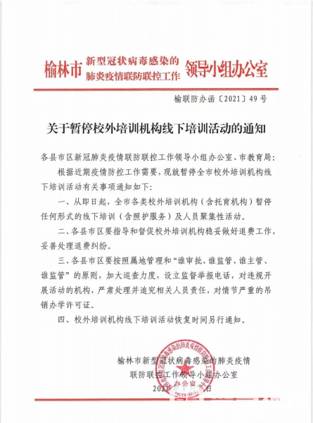 最新发布!榆林暂停校外培训机构线下培训活动!