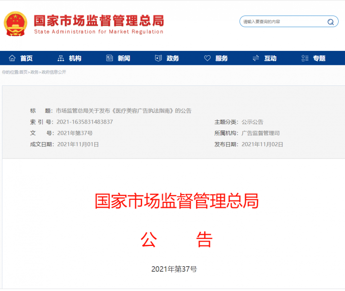 据“国家市场监督管理总局”官网消息,为规范和加强医疗美容广告监管,有效维护医疗美容广告市场秩序,保护消费者合法权益,依据《中华人民共和国广告法》《医疗广告管理办法》等法律、法规和规章的规定,市 ...