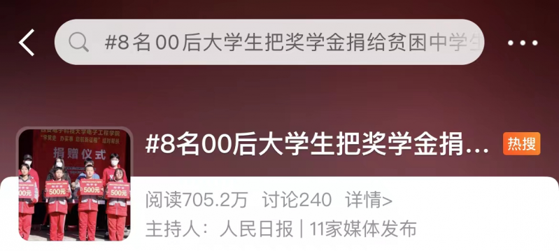 近日“8名大学生把奖学金捐给中学生”在网络刷屏↓↓↓ 来源:人民日报