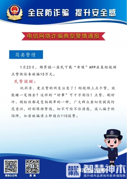 简 要 警 情: 1月23日,锦界镇一居民下载“希壤”APP在某短视频点赞做任务被骗15万元。 民 警 提 醒: 玩抖音、爱点赞的网友注意了!短视频上点个赞,就能赚一笔佣金?这样的“好事”可千万别信!点 ...