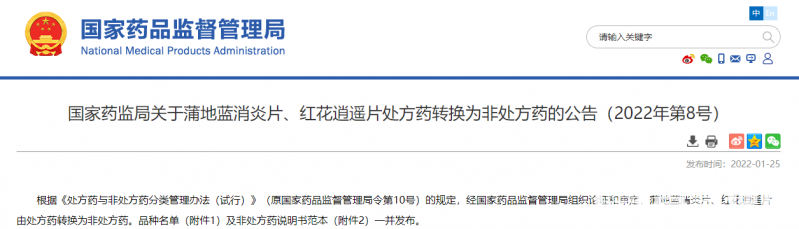 据国家药监局官网消息,国家药监局近日发布公告,经组织论证和审定,蒲地蓝消炎片、红花逍遥片由处方药转换为非处方药。 国家药监局表示,请相关药品上市许可持有人在2022年4月19日前,依据《药品注册管理 ...