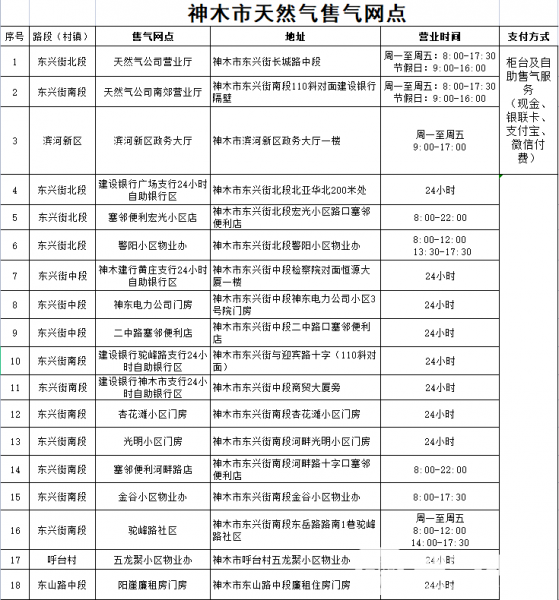 春节期间天然气公司营业厅正常营业;部分自助售气网点跟随各处营业时间确定;另设有各24小时售气网点,详见《神木市天然气售气网点》附后。天然气公司营业厅营业时间:1月31日-2月6日(除夕至正月初六)   ...