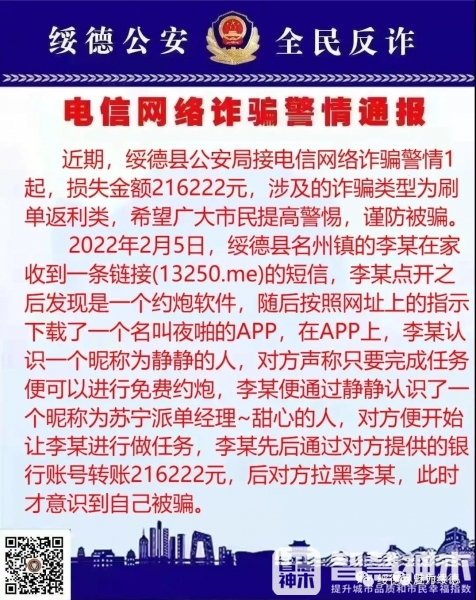 作案手法:第一步,诈骗份子以"约 炮"为名来诱导受害人点击链接下载APP。第二步,对方又以免费约 炮为由要求受害人进行做任务。最后,当受害人做完任务之后,诈骗份子立马拉黑消失了,这才发现自己被骗。 来 ...
