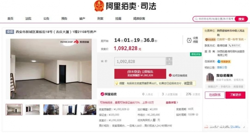 3月17日10时至5月16日10时,榆林中院将在淘宝网司法拍卖平台上,变卖西安市新城区吉庆大厦一处136㎡房产,变卖价109万元! 变卖信息 来源:榆林中院