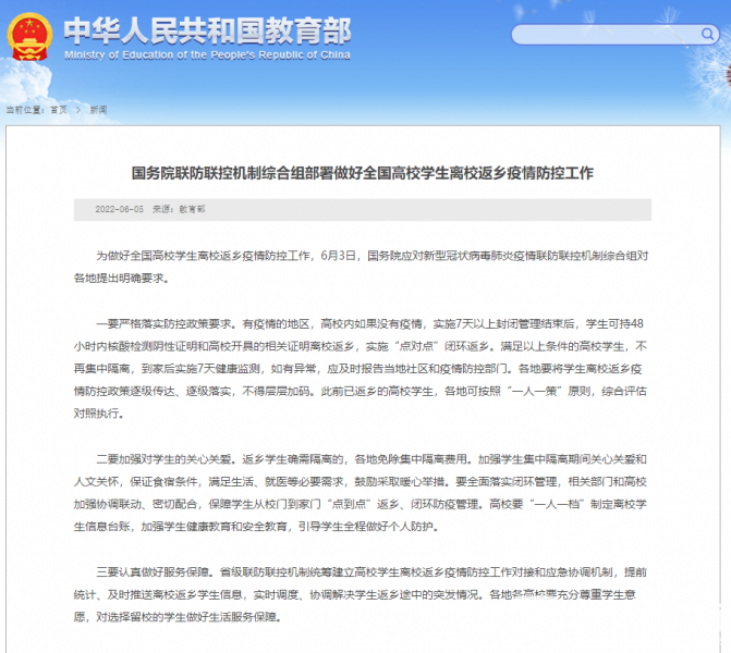 据教育部网站消息,为做好全国高校学生离校返乡疫情防控工作,6月3日,国务院应对新型冠状病毒肺炎疫情联防联控机制综合组对各地提出明确要求。 一要严格落实防控政策要求。有疫情的地区,高校内如果没有疫情,实施 ...