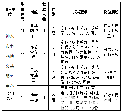 根据神木市中鸡镇公共服务中心工作需要,结合实际需求,委托陕西裕洋和实业集团股份有限公司面向社会公开招聘辅助工作人员。现将有关事项公告如下:一、招聘原则坚持“面向社会、公开招聘、公平竞争”的原则,按照德 ...