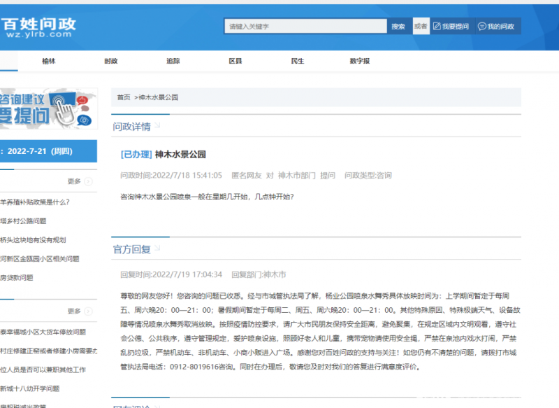 问:咨询神木水景公园喷泉一般在星期几开始,几点钟开始? 答: 尊敬的网友您好!您咨询的问题已收悉。经与市城管执法局了解,杨业公园喷泉水舞秀具体放映时间为:上学期间暂定于每周五、周六晚20:00—21:00 ...