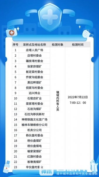 店塔镇关于7月22日开展全员核酸检测的公告 店塔镇广大居民朋友: 为全面落实神木市委、市政府应对新冠肺炎疫情工作部署,进一步加大筛查力度,科学高效应对疫情,切实保障人民群众身体健康和生命安全,经研究,决 ...