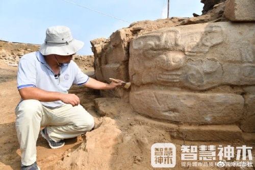考古工作者日前在陕西石峁遗址的核心区域皇城台新发现了一件大型人面石雕。石雕本体呈圆弧形,镶砌于皇城台大台基西南角的墙体之上。 石峁遗址地处黄土高原北部的陕西省神木市,其考古工作是中华文明探源工程 ...