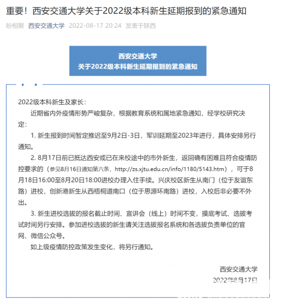 西安交通大学近期省内外疫情形势严峻复杂,根据教育系统和属地紧急通知,经学校研究决定:新生报到时间暂定推迟至9月2日-3日,军训延期至2023年进行,具体安排另行通知。 西北政法大学因新冠肺炎疫情近期有所反 ...