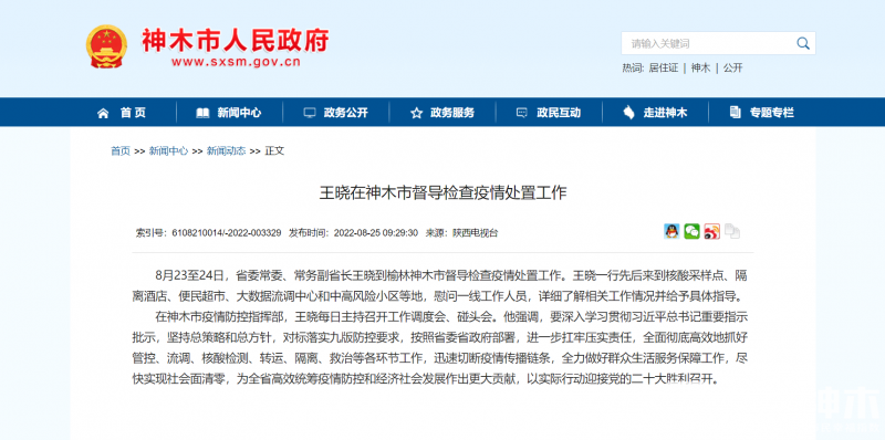 8月23至24日,省委常委、常务副省长王晓到榆林神木市督导检查疫情处置工作。王晓一行先后来到核酸采样点、隔离酒店、便民超市、大数据流调中心和中高风险小区等地,慰问一线工作人员,详细了解相关工作情况并给予 ...