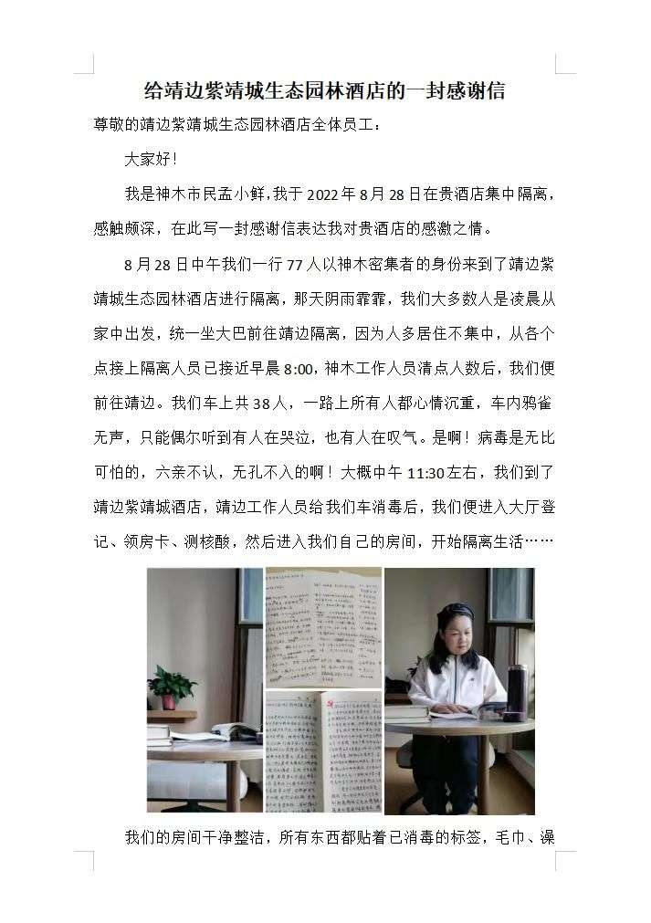 给靖边紫靖城生态园林酒店的一封感谢信 尊敬的靖边紫靖城生态园林酒店全体员工: 大家好! 我是神木市民孟小鲜,我于2022年8月28日在贵酒店集中隔离,感 ...