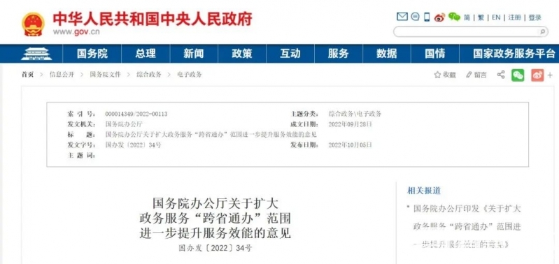 本帖最后由 政务服务中心 于 2022-10-9 15:31 编辑 中国政府网5日公布《国务院办公厅关于扩大政务服务“跨省通办”范围进一步提升服务效能的意见》(以下简称《意见》)。 内容来源于中国政府网