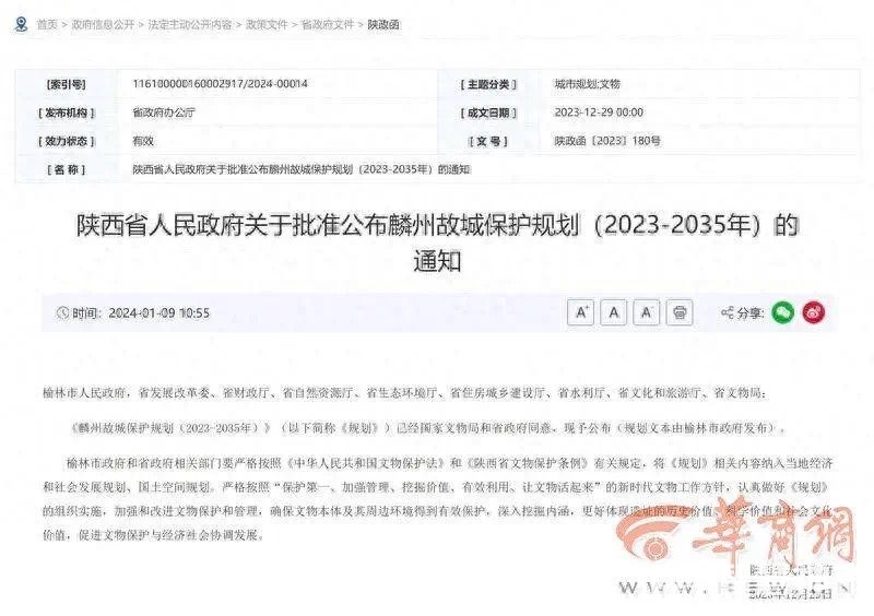 2024年1月9日,陕西省政府官网发布《陕西省人民政府关于批准公布麟州故城保护规划(2023-2035年)的通知》:《麟州故城保护规划(2023-2035年)》已经国家文物局和省政府同意,现予公布(规划文本由榆林市政府发布) ...