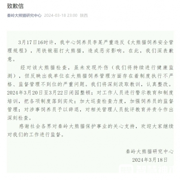 3月18日晚,秦岭大熊猫研究中心发布致歉信称,3月17日16时许,该中心饲养员李某严重违反《大熊猫饲养安全管理规程》,用铁锨驱打大熊猫,造成恶劣影响。在此,秦岭大熊猫研究中心深表歉意。 该中心表示,经对该大 ...