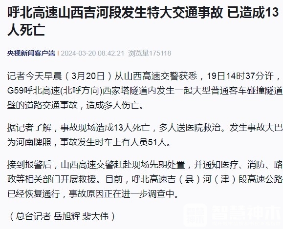 3月20日,央视新闻记者从山西高速交警获悉,3月19日14时37分许,G59呼北高速(北呼方向)西家塔隧道内发生一起大型普通客车碰撞隧道壁的道路交通事故,造成多人伤亡。 据记者了解,事故现场造成13人死亡,多人送医 ...