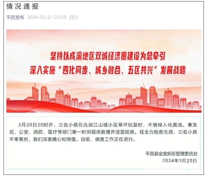 3月21日凌晨,四川“平昌发布”微信公众号发布情况通报: 3月20日20时许,三名小孩在兆润江山城小区草坪玩耍时,不慎掉入化粪池。事发后,公安、消防、医疗等部门第一时间现场救援并送医抢救。经全力抢救无效,三 ...