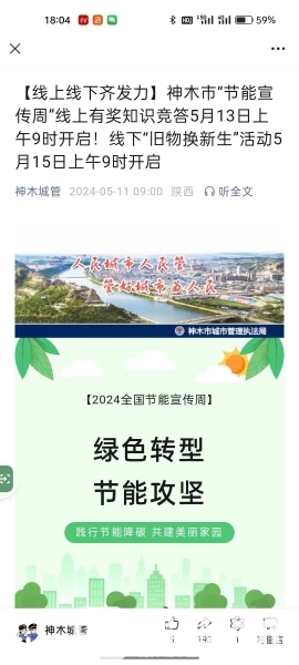 5月13日至19日是第34个全国节能宣传周。为扎实有效开展“绿色转型 节能攻坚”主题宣传活动,神木市城市管理执法局、神木市发展改革和科技局、神木市机关事务服务中心和神木市无废城市建设试点工作领导小组办公室联合 ...