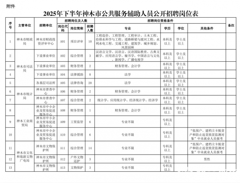2025年下半年神木市公共服务辅助人员公开招聘公告为了深入贯彻落实国家就业优先战略,推动高校毕业生和困难家庭未就业人员等群体就业,促进我市社会公共事业健康发展,市政府研究决定通过公开招聘考试方式为神木市财 ...