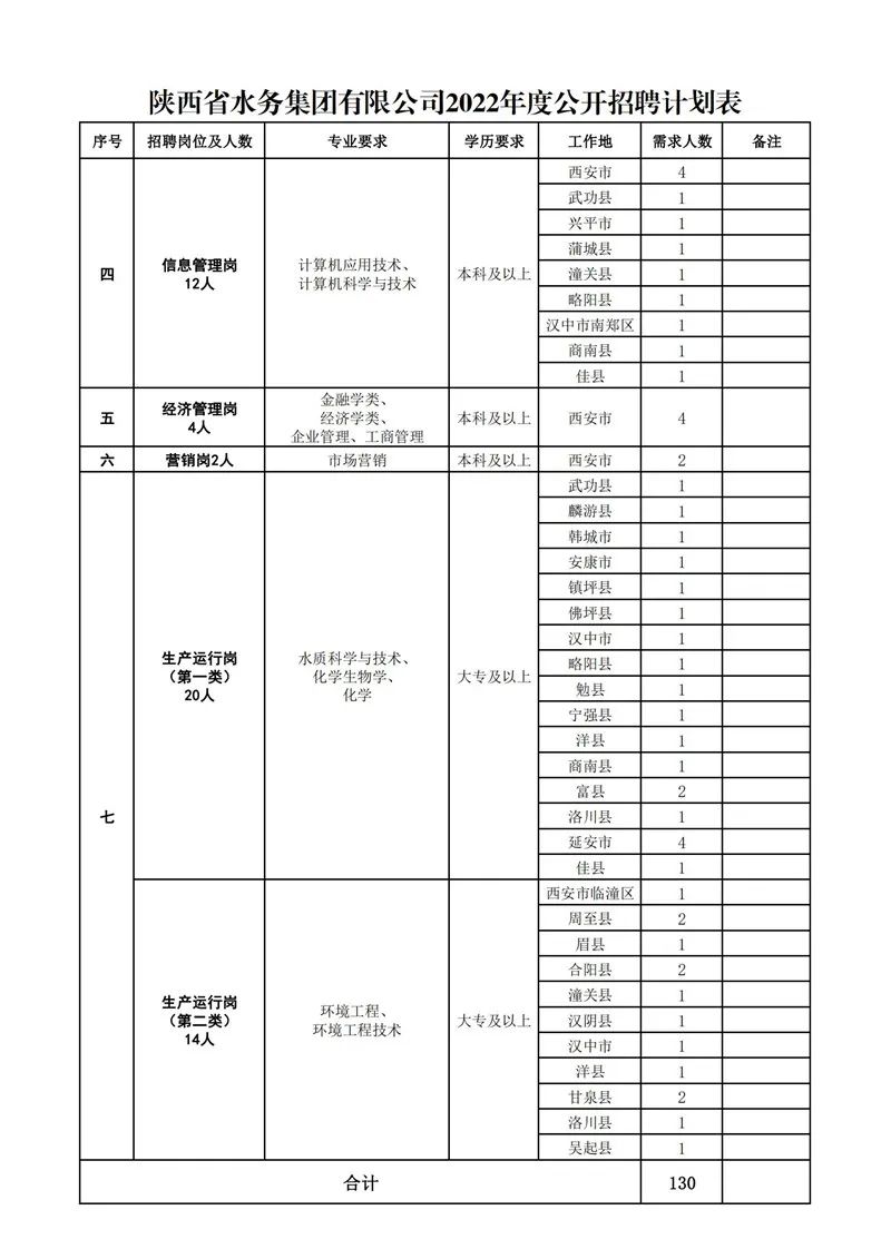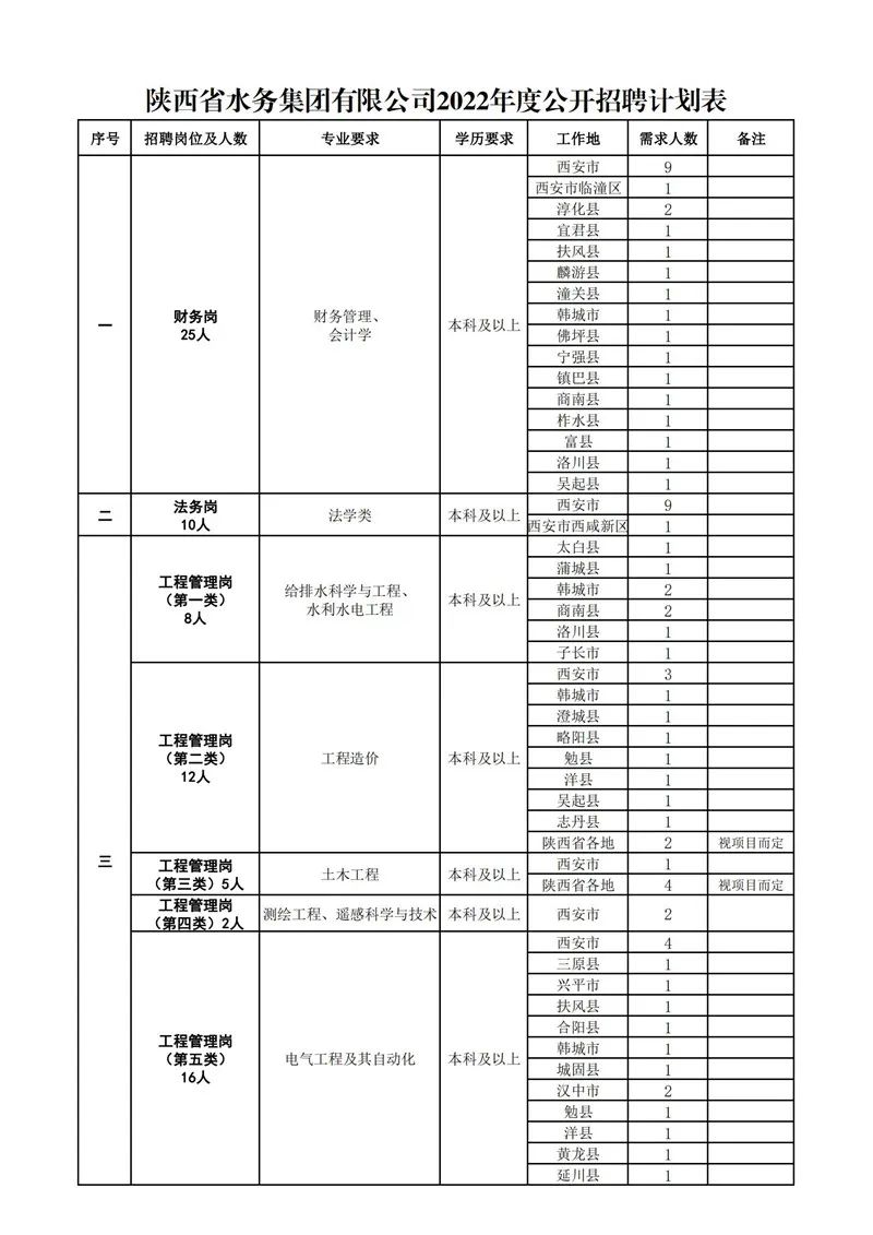 Ϊ¼Ó¿ì¹«Ë¾È˲ŶÓÎ齨É裬³äʵ»ù²ãÒ»ÏßÈËÔ±Á¦Á¿£¬ÉÂÎ÷ʡˮÎñ¼¯ÍÅÓÐÏÞ¹«Ë¾ÌØÃæÏòÉç»á¹«¿ªÕÐÆ¸130Ãû¹¤×÷ÈËÔ±£¬ÏÖ½«ÕÐÆ¸ÓйØÊÂÏ¸æÈçÏ£º Ò»¡¢¹«Ë¾¼ò½é ÉÂÎ÷ʡˮÎñ¼¯ÍÅÓÐÏÞ¹«Ë¾ÓÚ2011Äê3ÔÂÓÉÉÂÎ÷Ê¡Õþ¸®Åú×¼³ÉÁ¢£¬×¢²á×ʽð50ÒÚÔª£¬Îª¹úÓжÀ×ÊÆóÒµ£¬ÊÇÉÂÎ÷ʡˮÀûÐÐҵͶ×ÊÖ÷ÌåºÍË®Àû¹úÓÐ×ʲú¾Óª¹ÜÀíÖ÷Ì壬Ö÷Òª³Ðµ£Ë®Àû¹úÓÐ×ʲúÔËÓª¹ÜÀí¡¢´óÖÐÐÍË®Àû¹¤³ÌµÄÈÚ×Ê¡¢½¨ÉèºÍ¹ÜÀí¾ÓªÈÎÎñ£¬Ö÷ҵΪ³ÇÕò¹©Ë®¡¢Ë®µç¿ª·¢ÔËÓª¡¢ÎÛË®´¦Àí¡¢Ë®Éú̬ÖÎÀíºÍË®ÒûÆ·²úÏú£¬Êdzе£¸ÄÉÆÃñÉú¡¢·þÎñÉç»á¡¢±£ÕÏÉç»á¹«ÖÚÉú²úºÍÉú»îÕý³£ÔËÐÐÈÎÎñµÄ×¼¹«ÒæÐÔ¹«¹²·þÎñÀàÆóÒµ¡£ ¶þ¡¢ÕÐÆ¸»ù±¾Ìõ¼þ £¨Ò»£©Ó¦Æ¸ÈËÔ±»ù±¾Ìõ¼þ 1.¾ßÓÐÖлªÈËÃñ¹²ºÍ¹ú¹ú¼®¡£ 2.Óµ»¤Öйú**µÄÁìµ¼£¬Óµ»¤ÖйúÌØÉ«Éç»áÖ÷Òå»ù±¾ÕþÖÎÖÆ¶È¡£ 3.×ñÊØÏÜ·¨ºÍ·¨ÂÉ£¬¾ßÓÐÁ¼ºÃµÄÕþÖÎËØÑø¡¢×¨ÒµÄÜÁ¦¡¢Ö°Òµ²ÙÊØºÍÉíÌåËØÖÊ£¬ÎÞ²»Á¼¼Ç¼¡£ 4.¾ß±¸ÂÄÐиÚλְÔðËù±ØÐëµÄרҵ֪ʶºÍÖ´Òµ×ʸñ¡£ 5.ÈôΪ2022ÄêÓ¦½ì±ÏÒµÉú£¬Ó¦µ±ÓÚ2022Äê8ÔÂ31ÈÕǰȡµÃ±ÏÒµÖ¤¡¢Ñ§Î»Ö¤£»ÈôΪ¹ú£¨¾³£©Íâ¸ßУ±ÏÒµÉú£¬Ó¦µ±È¡µÃ¹ú¼Ò½ÌÓý²¿Áôѧ·þÎñÖÐÐĵÄѧÀú¼°Ñ§Î»ÈÏÖ¤¡£ 6.³Ô¿àÄÍÀÍ£¬·þ´Ó¹«Ë¾¹¤×÷·ÖÅ䣬ԸÒâµ½ÕÐÆ¸¸ÚλËùÔڵع¤×÷£¨²¿·Ö¹¤×÷µØÇø½ÏΪƫԶ£©¡£ £¨¶þ£©²»·ûºÏ±¨ÃûÌõ¼þµÄÖ÷ÒªÇéÐÎ 1.ÔøÒò·¸×ïÊܹýÐÌÊ´¦·£»òÒòÎ¥¹æÎ¥¼Í±»¿ª³ýµÄ£» 2.ÉæÏÓÎ¥¼ÍÎ¥·¨ÕýÔÚ½ÓÊÜÓйػú¹ØÉó²éÉÐδ×ö³ö½áÂ۵ģ» 3.ÔÚ¹«ÎñÔ±¡¢ÊÂÒµµ¥Î»¼°¹úÆóµÈÆäËüÕмÖÐÎ¥¹æÎ¥¼ÍµÄ£¬ÔÚ½û¿¼ÆÚÏÞÄڵģ» 4.·¨ÂÉ¡¢·¨¹æ¹æ¶¨µÄ²»·ûºÏÕÐÆ¸Ìõ¼þµÄ£» 5.ÉíÌå×´¿ö²»·ûºÏ¸ÚλҪÇóµÄ£» 6.ÆäËü²»Ò˱¨ÃûµÄ¡£ Èý¡¢ÕÐÆ¸¸Úλ £¨Ò»£©²ÆÎñ¸Ú ÕÐÆ¸ÈËÊý£º25ÈË ¹¤×÷µ¥Î»£ºÉÂÎ÷ʡˮÎñ¼¯ÍÅÓÐÏÞ¹«Ë¾ËùÊô×Ó¹«Ë¾ ¹¤×÷µØÇø£º¼û¸½¼þ¡¶ÉÂÎ÷ʡˮÎñ¼¯ÍÅÓÐÏÞ¹«Ë¾2022Äê¶È¹«¿ªÕÐÆ¸¼Æ»®±í¡· ѧÀúÒªÇ󣺱¾¿Æ¼°ÒÔÉÏ ×¨ÒµÒªÇ󣺲ÆÎñ¹ÜÀí¡¢»á¼ÆÑ§ ÄêÁäÒªÇó£º35ËêÒÔÏ£¨1987Äê1ÔÂ1ÈÕºó³öÉú£© ¸ÚλҪÇó£º 1. ÊìϤ¹ú¼Ò²Æ¾·¨ÂÉ¡¢·¨¹æºÍ˰ÊÕÏà¹ØÖªÊ¶£»ÊìϤ»á¼ÆÐÅÏ¢»¯£¬¾ß±¸½ÏÇ¿µÄ»á¼ÆÀíÂÛºÍʵÎñˮƽ¡£ 2. ¾ß±¸½ÏÇ¿µÄ¹«ÎÄд×÷ºÍ¹µÍ¨Ðµ÷ÄÜÁ¦¡£ 3. ÓÐ3Äê¼°ÒÔÉϵ³Õþ»ú¹Ø¡¢ÆóÊÂÒµµ¥Î»»ò»á¼ÆÊ¦ÊÂÎñËù»á¼ÆÏà¹Ø¹¤×÷¾Àú£¬5Äê¼°ÒÔÉϹ¤×÷¾ÀúÕßÓÅÏÈ¿¼ÂÇ£»È¡µÃ³õ¼¶¼°ÒÔÉÏ»á¼Æ×¨Òµ¼¼Êõ×ʸñÕßÓÅÏÈ¿¼ÂÇ¡£ £¨¶þ£©·¨Îñ¸Ú ÕÐÆ¸ÈËÊý£º¼¯ÍÅËùÊô×Ó¹«Ë¾×Ü·¨ÂɹËÎÊ5ÈË¡¢·¨ÎñÖ÷¹Ü5ÈË ¹¤×÷µ¥Î»£ºÉÂÎ÷ʡˮÎñ¼¯ÍÅÓÐÏÞ¹«Ë¾ËùÊô×Ó¹«Ë¾ ¹¤×÷µØÇø£º¼û¸½¼þ¡¶ÉÂÎ÷ʡˮÎñ¼¯ÍÅÓÐÏÞ¹«Ë¾2022Äê¶È¹«¿ªÕÐÆ¸¼Æ»®±í¡· ѧÀúÒªÇ󣺱¾¿Æ¼°ÒÔÉÏ ×¨ÒµÒªÇ󣺷¨Ñ§Àà ÄêÁäÒªÇó£º 1. ×Ü·¨ÂɹËÎÊ40ËêÒÔÏ£¨1982Äê1ÔÂ1ÈÕºó³öÉú£© 2. ·¨ÎñÖ÷¹Ü35ËêÒÔÏ£¨1987Äê1ÔÂ1ÈÕºó³öÉú£© ¸ÚλҪÇó£º 1. ӦƸ¼¯ÍÅËùÊô×Ó¹«Ë¾×Ü·¨ÂɹËÎÊÕߣ¬Ó¦È¡µÃ·¨ÂÉÖ°Òµ×ʸñÖ¤ÊéAÖ¤£»Ó¦Æ¸¼¯ÍÅËùÊô×Ó¹«Ë¾·¨ÎñÖ÷¹ÜÕߣ¬Óз¨ÂÉÖ°Òµ×ʸñÖ¤ÊéAÖ¤ÓÅÏÈ¿¼ÂÇ¡£ 2. ÓÐ3Äê¼°ÒÔÉϵ³Õþ»ú¹Ø»ò¹úÓÐÆóÊÂÒµµ¥Î»·¨ÂÉÊÂÎñÏà¹Ø¹¤×÷¾Àú£¬5Äê¼°ÒÔÉϹ¤×÷¾ÀúÕßÓÅÏÈ¿¼ÂÇ¡£ £¨Èý£©¹¤³Ì¹ÜÀí¸Ú 1.µÚÒ»Àà ÕÐÆ¸ÈËÊý£º8ÈË ¹¤×÷µ¥Î»£ºÉÂÎ÷ʡˮÎñ¼¯ÍÅÓÐÏÞ¹«Ë¾ËùÊô×Ó¹«Ë¾ ¹¤×÷µØÇø£º¼û¸½¼þ¡¶ÉÂÎ÷ʡˮÎñ¼¯ÍÅÓÐÏÞ¹«Ë¾2022Äê¶È¹«¿ªÕÐÆ¸¼Æ»®±í¡· ѧÀúÒªÇ󣺱¾¿Æ¼°ÒÔÉÏ ×¨ÒµÒªÇ󣺸øÅÅË®¿ÆÑ§Ó빤³Ì¡¢Ë®ÀûË®µç¹¤³Ì ÄêÁäÒªÇó£º35ËêÒÔÏ£¨1987Äê1ÔÂ1ÈÕºó³öÉú£© 2.µÚ¶þÀà ÕÐÆ¸ÈËÊý£º12ÈË ¹¤×÷µ¥Î»£ºÉÂÎ÷ʡˮÎñ¼¯ÍÅÓÐÏÞ¹«Ë¾ËùÊô×Ó¹«Ë¾ ¹¤×÷µØÇø£º¼û¸½¼þ¡¶ÉÂÎ÷ʡˮÎñ¼¯ÍÅÓÐÏÞ¹«Ë¾2022Äê¶È¹«¿ªÕÐÆ¸¼Æ»®±í¡· ѧÀúÒªÇ󣺱¾¿Æ¼°ÒÔÉÏ ×¨ÒµÒªÇ󣺹¤³ÌÔì¼Û ÄêÁäÒªÇó£º35ËêÒÔÏ£¨1987Äê1ÔÂ1ÈÕºó³öÉú£© ¸ÚλҪÇó£ºÈ¡µÃÔì¼Û¹¤³Ìʦ֤Êé 3.µÚÈýÀà ÕÐÆ¸ÈËÊý£º5ÈË ¹¤×÷µ¥Î»£ºÉÂÎ÷ʡˮÎñ¼¯ÍÅÓÐÏÞ¹«Ë¾ËùÊô×Ó¹«Ë¾ ¹¤×÷µØÇø£º¼û¸½¼þ¡¶ÉÂÎ÷ʡˮÎñ¼¯ÍÅÓÐÏÞ¹«Ë¾2022Äê¶È¹«¿ªÕÐÆ¸¼Æ»®±í¡· ѧÀúÒªÇ󣺱¾¿Æ¼°ÒÔÉÏ ×¨ÒµÒªÇó£ºÍÁľ¹¤³Ì ÄêÁäÒªÇó£º35ËêÒÔÏ£¨1987Äê1ÔÂ1ÈÕºó³öÉú£© ¸ÚλҪÇ󣺹¤×÷µØµãΪȫʡ¸÷µØÏîÄ¿µÄ4ÈËÐëÈ¡µÃÊ©¹¤Ô±Ö¤ÊéºÍ½¨Ôìʦ֤Êé 4.µÚËÄÀà ÕÐÆ¸ÈËÊý£º2ÈË ¹¤×÷µ¥Î»£ºÉÂÎ÷ʡˮÎñ¼¯ÍÅÓÐÏÞ¹«Ë¾ËùÊô×Ó¹«Ë¾ ¹¤×÷µØÇø£º¼û¸½¼þ¡¶ÉÂÎ÷ʡˮÎñ¼¯ÍÅÓÐÏÞ¹«Ë¾2022Äê¶È¹«¿ªÕÐÆ¸¼Æ»®±í¡· ѧÀúÒªÇ󣺱¾¿Æ¼°ÒÔÉÏ ×¨ÒµÒªÇó£º²â»æ¹¤³Ì¡¢Ò£¸Ð¿ÆÑ§Óë¼¼Êõ ÄêÁäÒªÇó£º35ËêÒÔÏ£¨1987Äê1ÔÂ1ÈÕºó³öÉú£© 5.µÚÎ