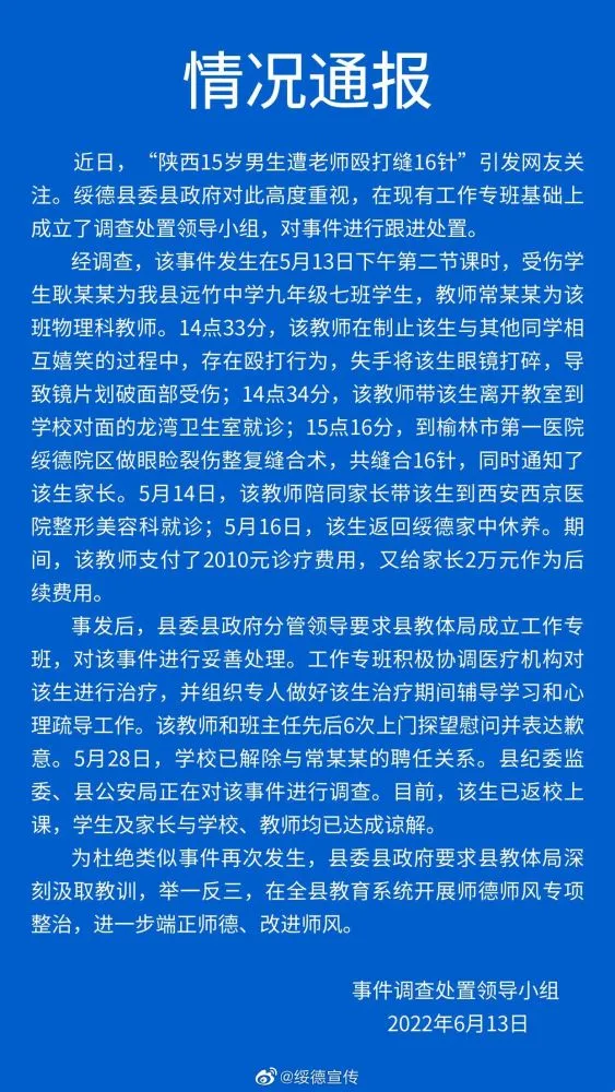 6ÔÂ13ÈÕÍí£¬ÉÂÎ÷Ê¡ÓÜÁÖÊÐËçµÂÏØÎ¯Ðû´«²¿¹Ù·½Î¢²©¾Í“ÉÂÎ÷15ËêÄÐÉúÔâÀÏʦŹ´ò·ì16Õë”һʷ¢²¼Í¨±¨£¬Í¨±¨³ÆÑ§Ð£Òѽâ³ýÓëÉæÊ½Ìʦ³£Ä³Ä³µÄƸÈιØÏµ£¬¸ÃÉúÒÑ·µÐ£ÉϿΡ£È«ÎÄÈçÏ£º