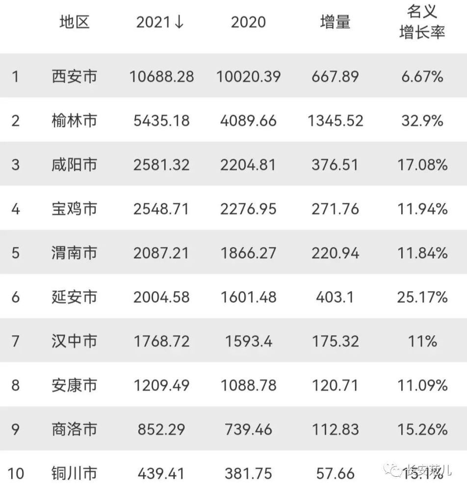Ŀǰ£¬ÉÂÎ÷Ê¡¹²ÏÂϽ10¸öµØ¼¶ÊУ¬¸ù¾Ý2021ÄêGDP×ÜÁ¿µÄ¸ßµÍ£¬ÒÀ´ÎΪÎ÷°²£¨10688.28ÒÚÔª£©¡¢ÓÜÁÖ£¨5435.18ÒÚÔª£©¡¢ÏÌÑô£¨2581.32ÒÚÔª£©¡¢±¦¼¦£¨2548.71ÒÚÔª£©¡¢Î¼ÄÏ£¨2087.21ÒÚÔª£©¡¢ÑÓ°²£¨2004.58ÒÚÔª£©¡¢ººÖУ¨1768.72ÒÚÔª£©¡¢°²¿µ£¨1209.49ÒÚÔª£©¡¢ÉÌÂ壨852.29ÒÚÔª£©¡¢Í­´¨£¨439.41ÒÚÔª£©¡£