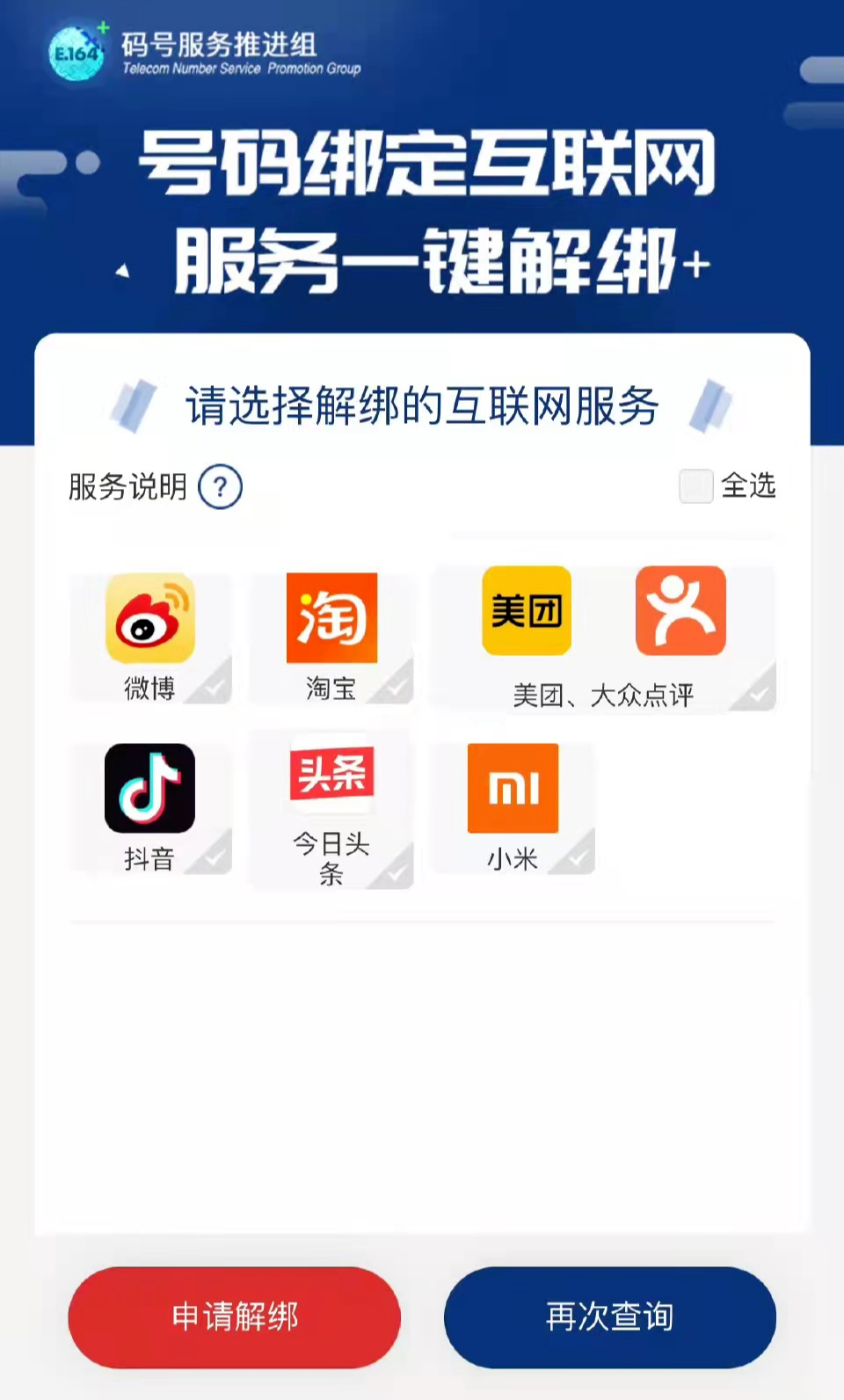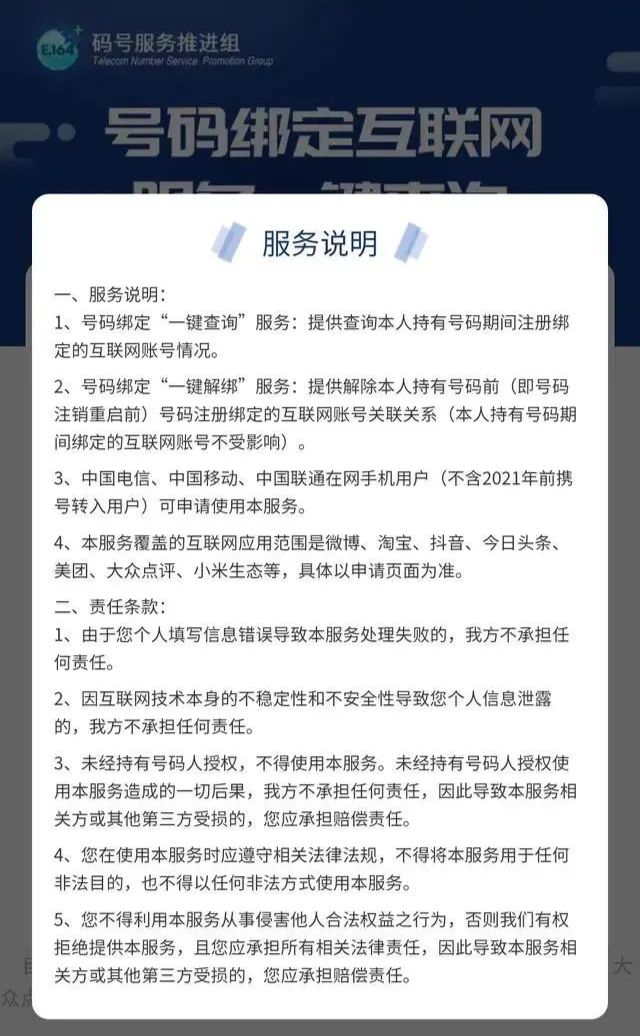 ÈçºÎ²éѯÊÖ»úºÅ°ó¶¨ÁËÄÄЩAPP£¿ ÈçºÎÄܱã½ÝµØÊµÏÖ½â°ó£¿ ÖйúÐÅͨԺÔÚ“ºÅÂë°ó¶¨”µÄ·þÎñÉùÃ÷Öбíʾ£¬ºÅÂë°ó¶¨“Ò»¼ü²éѯ”·þÎñÌṩ²éѯ±¾È˳ÖÓкÅÂëÆÚ¼ä×¢²á°ó¶¨µÄ»¥ÁªÍøÕ˺ÅÇé¿ö£»ºÅÂë°ó¶¨“Ò»¼ü½â°ó”·þÎñÌṩ½â³ý±¾È˳ÖÓкÅÂëǰ£¨¼´ºÅÂë×¢ÏúÖØÆôǰ£©ºÅÂë×¢²á°ó¶¨µÄ»¥ÁªÍøÕ˺ŹØÁª¹ØÏµ£¨±¾È˳ÖÓкÅÂëÆÚ¼ä°ó¶¨µÄ»¥ÁªÍøÕ˺Ų»ÊÜÓ°Ï죩¡£ ÉùÃ÷»¹ÌرðÖ¸³ö£¬ÖйúµçÐÅ¡¢ÖйúÒÆ¶¯¡¢ÖйúÁªÍ¨ÔÚÍøÊÖ»úÓû§£¨²»º¬2021ÄêǰЯºÅתÈëÓû§£©¿ÉÉêÇëʹÓñ¾·þÎñ¡£±¾·þÎñ¸²¸ÇµÄ»¥ÁªÓ¦Ó÷¶Î§ÊÇ΢²©¡¢ÌÔ±¦¡¢¶¶Òô¡¢½ñÈÕÍ·Ìõ¡¢ÃÀÍÅ¡¢´óÖÚµãÆÀ¡¢Ð¡Ã×Éú̬µÈ£¬¾ßÌåÒÔÉêÇëÒ³ÃæÎª×¼¡£
