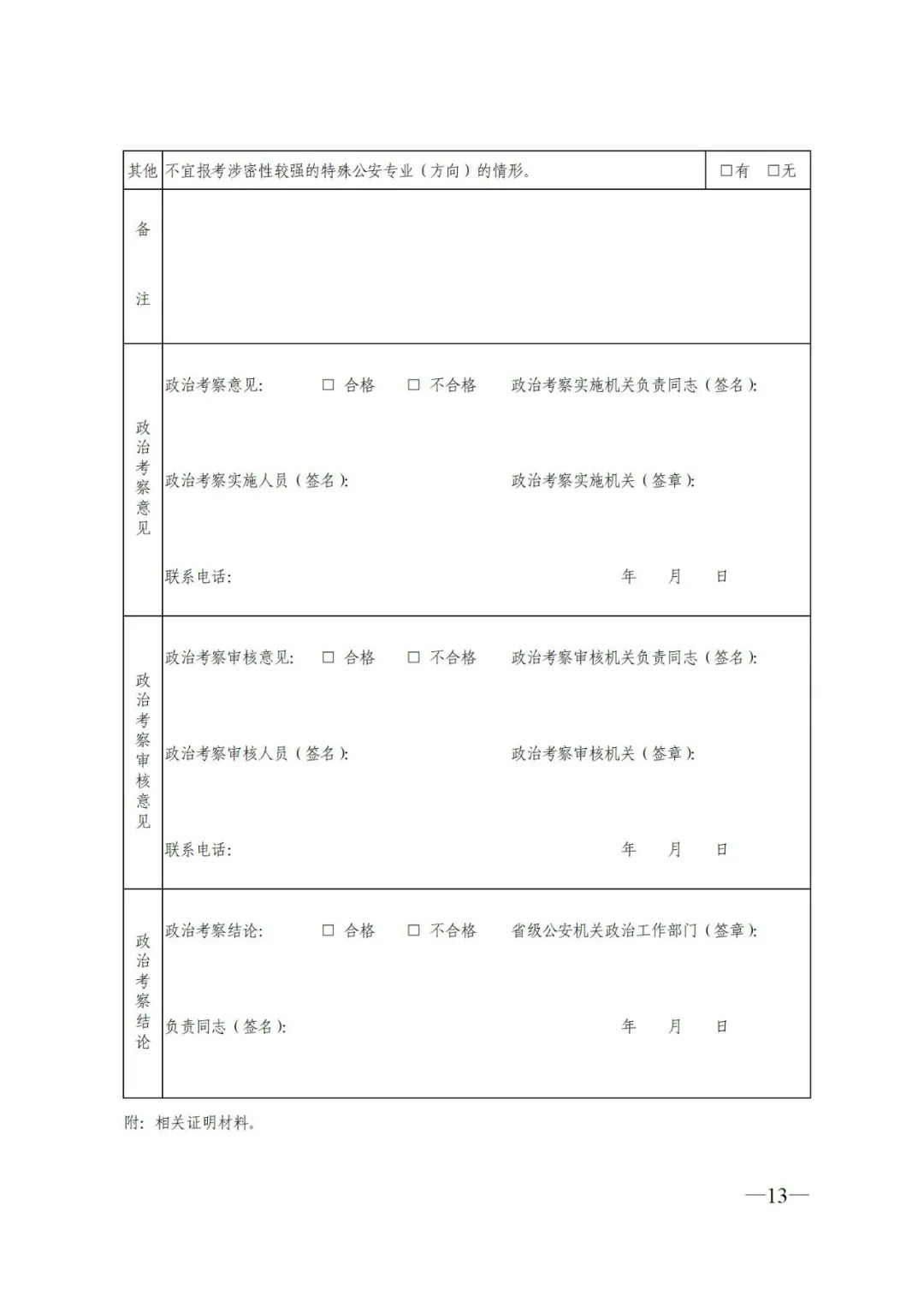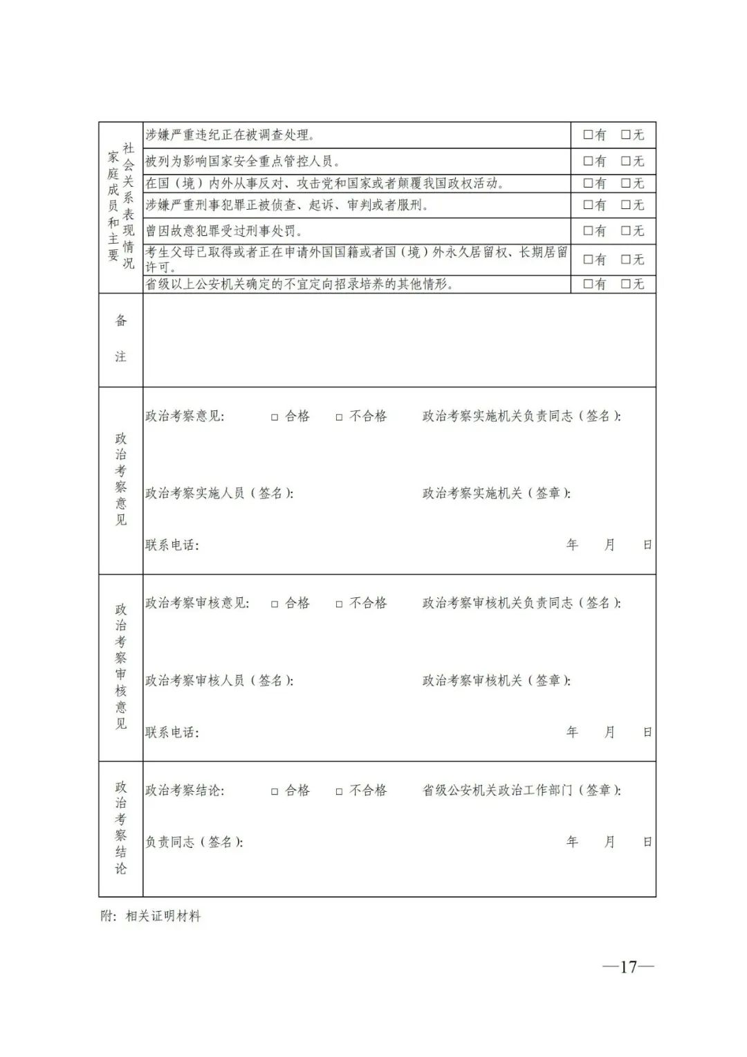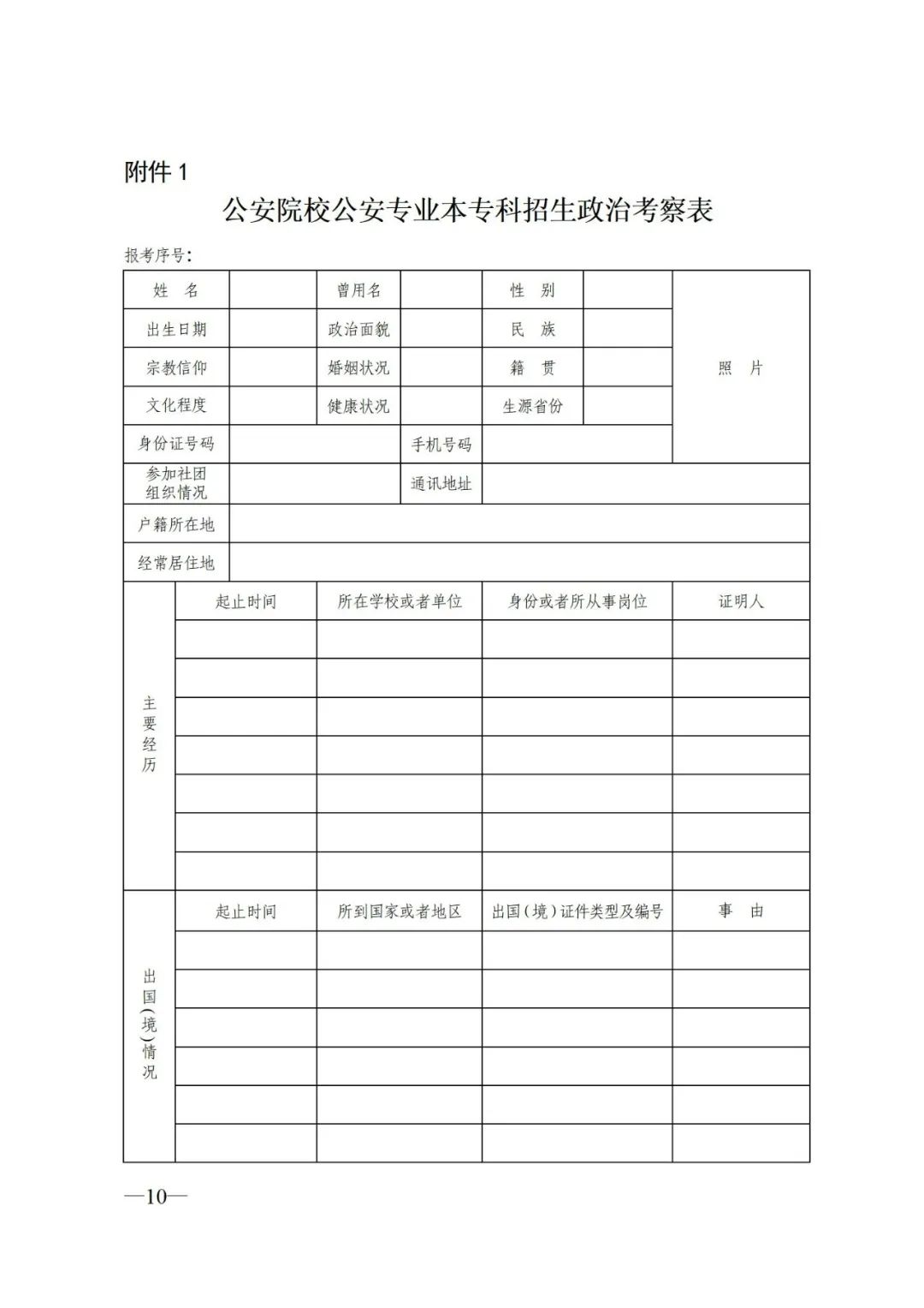 ±¨¿¼¹«°²ÔºÐ£¹«°²×¨Òµ£¨Ð½®¾¯²ìѧԺ³ýÍ⣩µÄ¿¼ÉúÐë×ÔÐÐÏÂÔØ´òÓ¡¡¶¹«°²ÔºÐ£¹«°²×¨Òµ±¾×¨¿ÆÕÐÉúÕþÖο¼²ì±í¡·£¨ÒÔϼò³Æ¿¼²ì±í£¬¼û¸½¼þ1£©£»±¨¿¼Ð½®¾¯²ìѧԺµÄ¿¼ÉúÐë×ÔÐÐÏÂÔØ´òÓ¡¡¶2022ÄêÕì²éѧרҵ£¨Î¬Óï·½Ïò£©È˲Ŷ¨ÏòÕмÅàÑø¿¼²ì±í¡·£¨¸½¼þ2£©£¬Á½±í±ØÐëÓÃA4Ö½Õý·´Á½Ãæ´òÓ¡¡£±íÖлù±¾Çé¿ö²¿·Ö¼°Ö÷Òª¾­Àú¡¢³ö¹ú£¨¾³£©Çé¿ö¡¢ÊÜ´¦·Ö»òÕßÎ¥·¨·¸×ïÇé¿ö¡¢¼ÒÍ¥³ÉÔ±Çé¿ö¡¢Ö÷ÒªÉç»á¹ØÏµÇé¿öÓÉ¿¼Éú±¾ÈËÌîд£¨²»µÃÍ¿¸Ä£©¡£¿¼Éú±¾ÈËÌîдÄÚÈÝ¡¢¿¼Éú±íÏÖÇé¿ö¡¢¼ÒÍ¥³ÉÔ±ºÍÖ÷ÒªÉç»á¹ØÏµ±íÏÖÇé¿ö£¬ÓÉ»§¼®ËùÔÚµØÅɳöËùͨ¹ýÍøÉϺ˲顢µµ°¸ÉóºË¡¢×߷õ÷²é¡¢Î¯Íе÷²éµÈ·½Ê½¿ªÕ¹¿¼²ì¹¤×÷£¬Ìá³öÕþÖο¼²ìÒâ¼û£¬Ç©×Ö²¢¼Ó¸Ç¹«Õ£¬Ïؼ¶¹«°²»ú¹Ø¸ºÔðͬ־ÔÚÕþÖο¼²ìʵʩ»ú¹Ø¸ºÔðͬ־´¦Ç©×Ö²¢¼Ó¸Ç¹«Õ¡£Êм¶¹«°²»ú¹ØÕþ¹¤²¿ÃÅÔÚÕþÖο¼²ìÉóºËÒâ¼ûÀ¸ÄÚ£¬ÌîдÕþÖο¼²ìÉóºËÒâ¼û£¬Ç©×Ö²¢¼Ó¸Ç¹«Õ¡£ÕþÖο¼²ìºÏ¸ñ¿¼ÉúµÄ¿¼²ì±íÃÜ·â½»¿¼Éú±¾ÈË£¬ÔÚÃæÊÔʱ½»Ê¡¹«°²ÌüÕþÖβ¿¡£Ê¡¹«°²ÌüÕþÖβ¿¶Ô¿¼²ìÇé¿ö½øÐзÖÎö£¬×ÛºÏ×÷³öÕþÖο¼²ì½áÂÛ¡£¸÷ÊС¢ÏØ£¨Çø£©Õа죬¸÷ÊС¢ÏØ£¨Çø£©¹«°²¾Ö£¨·Ö¾Ö£©ºÍÅɳöËù£¬Òª¸ß¶ÈÖØÊÓ±¨¿¼¹«°²ÔºÐ£¹«°²×¨Òµ¿¼ÉúµÄÕþÖο¼²ì¹¤×÷£¬ÈÏÕæ¸ºÔ𣬲»µÃŪÐé×÷¼Ù¡¢²»µÃÍÆÚᢲ»µÃÏò¿¼ÉúÊÕÈ¡ÈκηÑÓá£