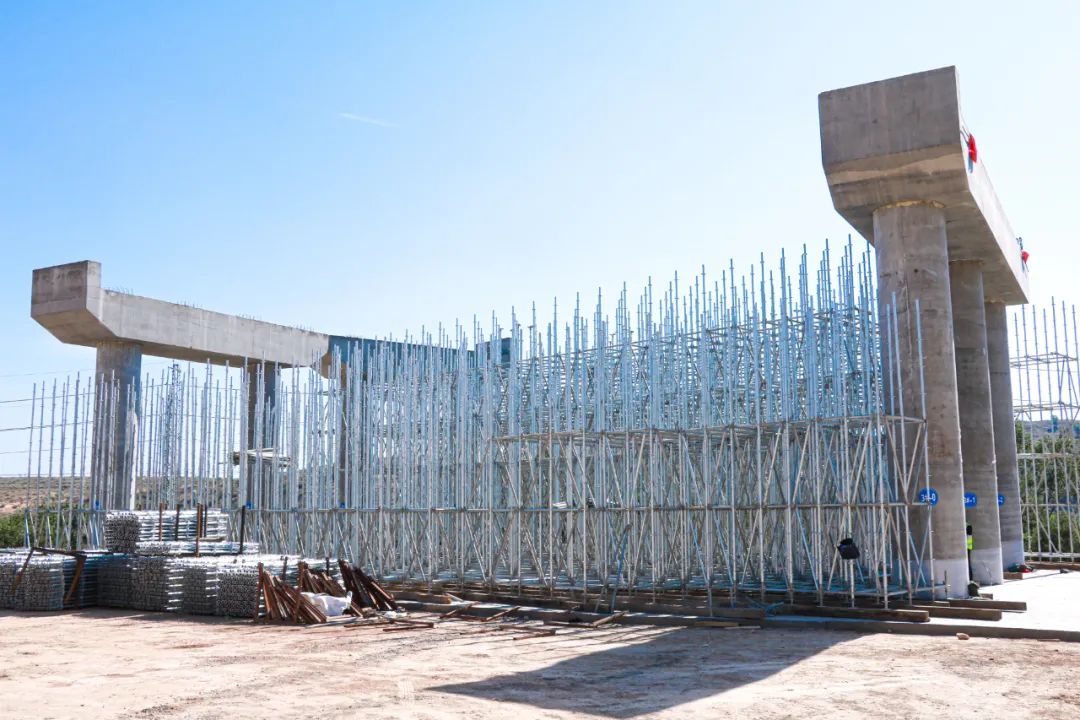 ÏîÄ¿¹²·Ö7¸ö±ê¶ÎÊ©¹¤£¬ÉèÃô¸ÇÍû¥Í¨Á¢½»Ò»´¦£¬ÇÅÁº4×ù¡£ÆäÖУ¬´óÇÅ801m/1×ù£¬ÖÐÇÅ162m/2×ù£¬ÇÅÁº×ܳ¤963m£»Ö÷ÏßÉèÖÃÖÐÇÅ3×ù£¬×ܳ¤221m£»¿çÏßÇÅ1×ù£¬Çų¤102Ã×£»È«Ïߺ­¶´34µÀ£¬Í¨µÀ3×ù£¬·ÖÀëʽ½»²æ2´¦¡£Ä¿Ç°£¬ÏîÄ¿ÒÑÍê³É×®»ù116¸ù¡¢ÏµÁº43µÀ¡¢³Ð̨1×ù¡¢¶ÕÖù59¸ù¡¢ÇĄ̊¡¢¸ÇÁº10×ù¡¢ÏäÁºÔ¤ÖÆ42ƬµÈ£»Ãô¸ÇÍû¥Í¨ÇøÕý½øÐÐFÔѵÀµÚ¶þÁª¡¢µÚÈýÁªÏÖ½½ÏäÁºÖ§¼Ü´îÉ裬¿ªÆôÏÖ½½ÏäÁºÊ©¹¤£»Ãô¸ÇÍÃ1ºÅÇÅ×®»ùÕýÔÚÊ©¹¤£¬Ãô¸ÇÍÃ2ºÅÇÅ×®»ùÊ©¹¤ÒÑÈ«²¿Íê³É£¬½øÈëÇÅÁºÏ²¿Ê©¹¤½×¶Î£»·ÖÀëÁ¢Ìå½»²æ¿çÏßÇÅÍê³ÉÁº°å¼ÜÉ裬¿ªÆôÇÅÃæÏµ¹¤×÷¡£Â·ÃæÆ½¿Ó¡¢ÍÚÌî·½¡¢»¤ÆÂµÈ¹¤³ÌÓÐÐòÍÆ½ø¡£