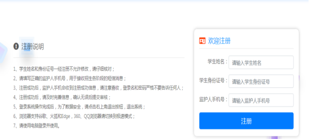 ¶þ¡¢±¨ÃûÁ÷³Ì 1.×¢²á±¨Ãû ˵Ã÷£º±¨Ãû¿ªÆôºó£¬½øÈ뱨Ãû½çÃæ£¬Îñ±ØÏÈÔĶÁ×ó·½µÄ×¢²á˵Ã÷£¬ÔÙÊäÈëÕýÈ·µÄѧÉúÐÕÃû¡¢Ñ§ÉúÉí·ÝÖ¤ºÅÂë¡¢¼à»¤ÈËÊÖ»úºÅ£¬È·±£ËùÌîдµÄÐÅÏ¢ÕýÈ·¡£µã»÷“×¢²á”³öÏÖ²»³É¹¦Ê±£¬ÏµÍ³»á¸øÓèÏàÓ¦µÄ³ö´íÔÒòÌáʾ£¬Çë²ÎÕÕÌáʾ½øÐвÙ×÷¡£×¢²á³É¹¦Ö®ºó£¬ÏµÍ³Éú³ÉµÄÐÅÏ¢»áÒÔ¶ÌÐŵķ½Ê½·¢Ë͵½ÊÖ»úÉÏ£¬ÇëÎñ±ØÀμÇÏà¹ØÐÅÏ¢¡£