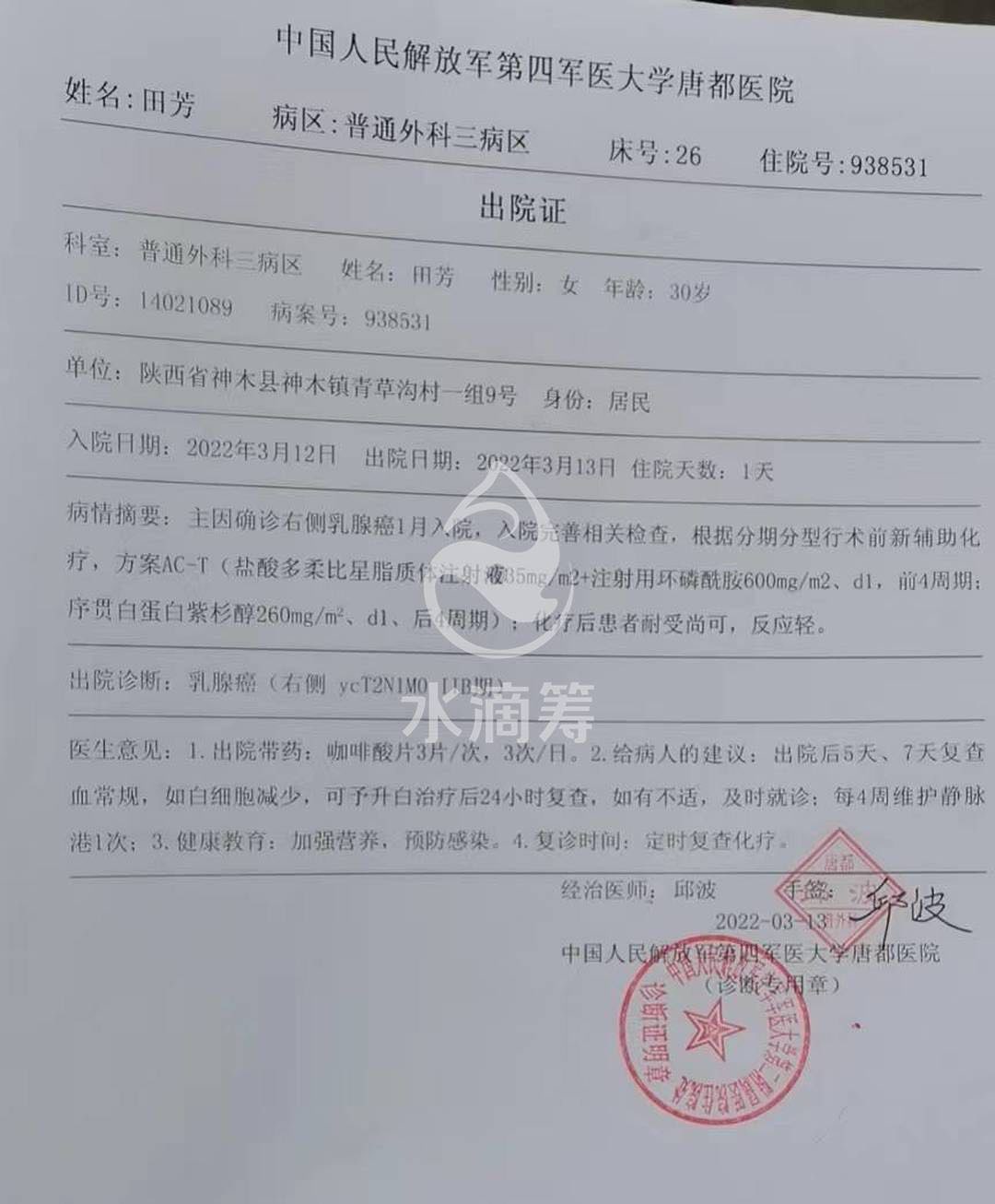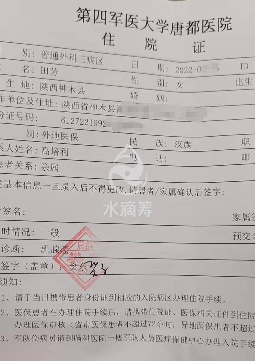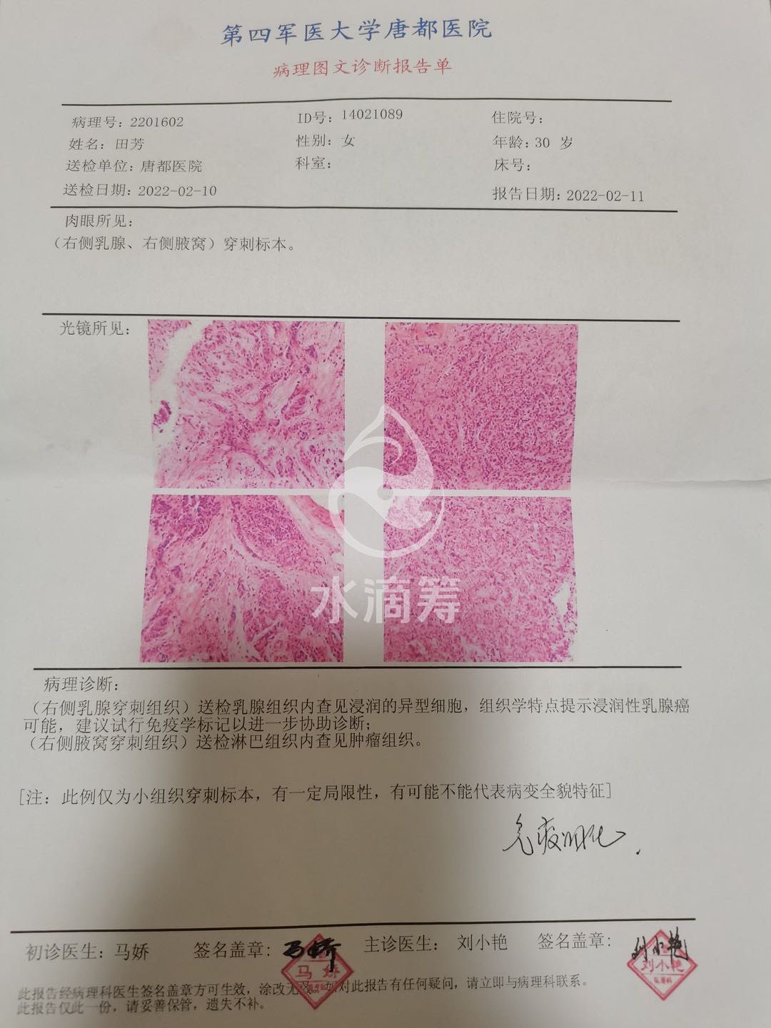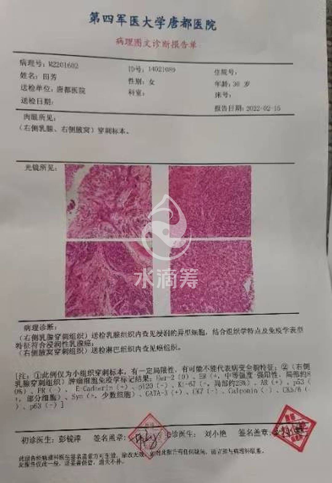 ²¡Çé¾­¹ý£ºÉúÍ꺢×Ó²¸ÈéÆÚ½áÊøºó£¬ÎÒ·¢ÏÖÓÒ²àÈéÏÙ°ü¿é£¬µ±Ê±¼ì²éÊÇ3À࣬Á¼ÐÔ£¬Ã»ÓÐÔÚÒâ¡£¼ÙÆÚ×¼±¸ÊÖÊõ£¬ÒòΪÒßÇéÔ­Òòµ¢ÎóÁË£¬Äê³õ2Ô·ݣ¬ËìÀ´Î÷°²Ìƶ¼Ò½Ôº¾ÍÕ×öÁËÈ«Ãæ¼ì²é£¬²¡Àí´©´Ì»î¼ì£¬È·ÕïΪ¡¾½þÈóÐÍÈéÏÙ°©2ÆÚ¡¿Ò½ÉúµÄÖÎÁÆ·½°¸ÎªÏÈ»¯ÁÆ8´Î£¬ºóÊÖÊõ£¬È»ºóÔÙ·ÅÁÆ£¬»¯ÁÆÆÚ¼äÓÉÓÚÉíÌåËØÖʲîÒýÆðÖØ¶È¹ÇËèÒÖÖÆ£¬×¡ÔºÆµ´ÎÔö¼Ó£¬·ÑÓÃÒ²¸ü´ó£¬ÏÖÔÚ¸Õ×öµÄÊÖÊõ£¬Ç°ÆÚ×öÁË8´Î»¯ÁÆ+Õâ´ÎÊÖÊõ£¬ÀÛ¼ÆÒÑ»¨·Ñ22Íò£¬Ç×ÈËÃÇÄܰïµÄ¶¼°ïÁË£¬ÄܽèµÄ¶¼½èÁË£¬ºóÆÚ»¹ÐèÒª·ÅÁÆ£¬5ÄêÄÚ·ÖÃÚÖÎÁÆ£¬ºóÐøµÄÖÎÁÆ·ÑÓöÔÓÚÎÒÀ´Ëµ£¬ÓÐÒ»¶¨µÄÀ§ÄÑ¡­¡­ÔÚÍò°ãÎÞÄÎÖ®¼Ê£¬Ö»ºÃÇóÖúÓÚÉç»á¸÷½çÈËÊ¿¡£