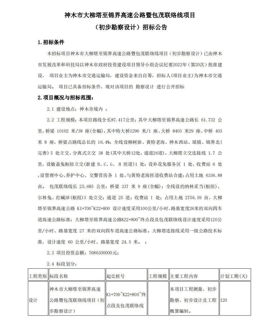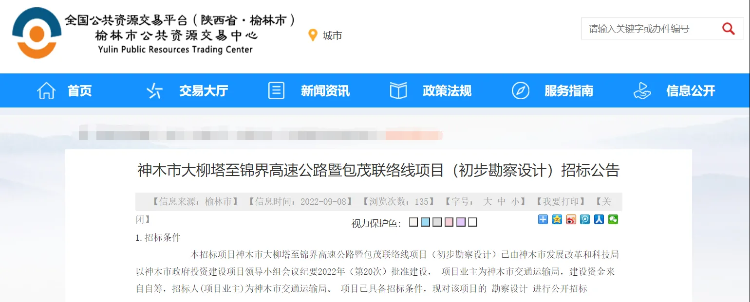 9ÔÂ8ÈÕ£¬ÓÜÁÖÊй«¹²×ÊÔ´½»Ò×ÖÐÐÄ·¢²¼¡¶ÉñľÊдóÁøËþÖÁ½õ½ç¸ßËÙ¹«Â·ôß°üïÁªÂçÏßÏîÄ¿£¨³õ²½¿±²ìÉè¼Æ£©Õб깫¸æ¡·£¬´ó£¨ÁøËþ£©½õ£¨½ç£©ºì£¨¼îÄ×£©¸ßËÙ¹«Â·ÏîÄ¿³õ²½¿±²ìÉè¼Æ¿ªÊ¼Õбꡣ