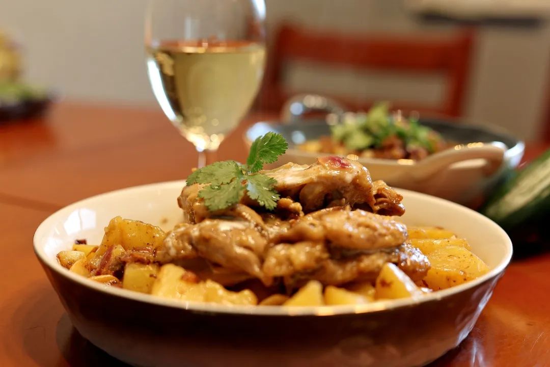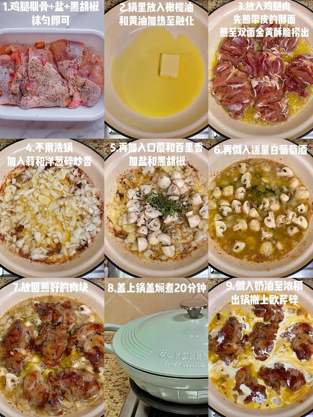×ö·¨ 1. ¼¦ÍÈÌÞ¹Ç+ÑÎ+ºÚºú½·Ä¨ÔÈ¡£ 2. ¹øÀï·ÅÈëéÏéÓͺͻÆÓͼÓÈÈÖÁÈÚ»¯¡£ 3. ·ÅÈ뼦ÍÈÈ⣬ÏÈ¼å´øÆ¤µÄÄÇÃæ£¬¼åÖÁË«Ãæ½ð»ÆËÖ´àÀ̳ö¡£ 4. ²»ÓÃÏ´¹ø¼ÓÈëËâºÍÑó´ÐËé³´Ïã¡£ 5. ¼ÓÈë¿ÚÄ¢ºÍ°ÙÀïÏ㣬ÔÙ¼ÓÑκͺںú½·¡£ 6. ÔÙµ¹ÈëÊÊÁ¿°×ÆÏÌѾơ£ 7. ·Å»Ø¼åºÃµÄÈâ¿é¡£ 8. ¸ÇÉϹø¸ÇìËÖó20·ÖÖÓ¡£ 9. µ¹ÈëÄÌÓÍÖÁŨ³í£¬³ö¹øÈöÉÏÅ·ÇÛËé¡£