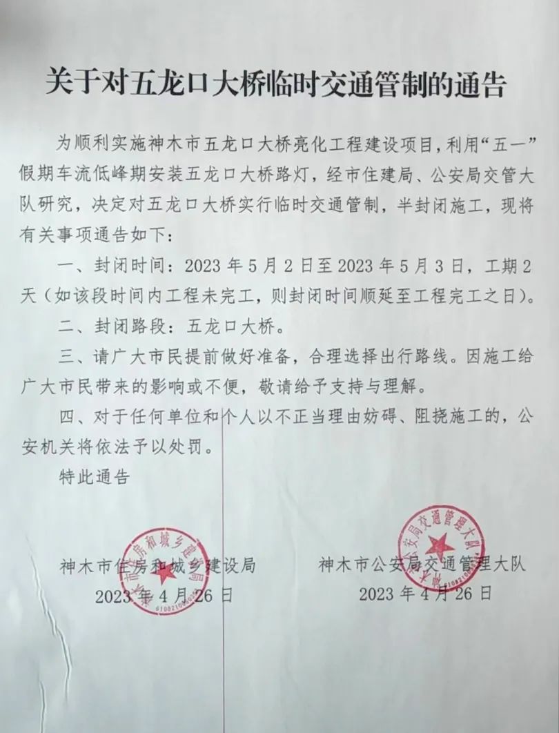 ¹ØÓÚ¶ÔÎåÁú¿Ú´óÇÅÁÙʱ½»Í¨¹ÜÖÆµÄͨ¸æ Ϊ˳ÀûʵʩÉñľÊÐÎåÁú¿Ú´óÇÅÁÁ»¯¹¤³Ì½¨ÉèÏîÄ¿£¬ÀûÓÓÎåÒ»”¼ÙÆÚ³µÁ÷µÍ·åÆÚ°²×°ÎåÁú¿Ú´óÇÅ·µÆ£¬¾ÊÐס½¨¾Ö¡¢¹«°²¾Ö½»¹Ü´ó¶ÓÑо¿£¬¾ö¶¨¶ÔÎåÁú¿Ú´óÇÅʵÐÐÁÙʱ½»Í¨¹ÜÖÆ£¬°ë·â±ÕÊ©¹¤£¬ÏÖ½«ÓйØÊÂÏîͨ¸æÈçÏ£º Ò»¡¢·â±Õʱ¼ä£º2023Äê5ÔÂ2ÈÕÖÁ2023Äê5ÔÂ3ÈÕ£¬¹¤ÆÚ2Ì죨Èç¸Ã¶Îʱ¼äÄÚ¹¤³ÌδÍ깤£¬Ôò·â±Õʱ¼ä˳ÑÓÖÁ¹¤³ÌÍ깤֮ÈÕ£©¡£ ¶þ¡¢·â±Õ·¶Î£ºÎåÁú¿Ú´óÇÅ¡£ Èý¡¢Çë¹ã´óÊÐÃñÌáǰ×öºÃ×¼±¸£¬ºÏÀíÑ¡Ôñ³öÐзÏß¡£ÒòÊ©¹¤¸ø¹ã´óÊÐÃñ´øÀ´µÄÓ°Ïì»ò²»±ã£¬¾´Çë¸øÓèÖ§³ÖÓëÀí½â¡£ ËÄ¡¢¶ÔÓÚÈκε¥Î»ºÍ¸öÈËÒÔ²»Õýµ±ÀíÓÉ·Á°¡¢×èÄÓÊ©¹¤µÄ£¬¹«°²»ú¹Ø½«ÒÀ·¨ÓèÒÔ´¦·£¡£ ÌØ´Ëͨ¸æ